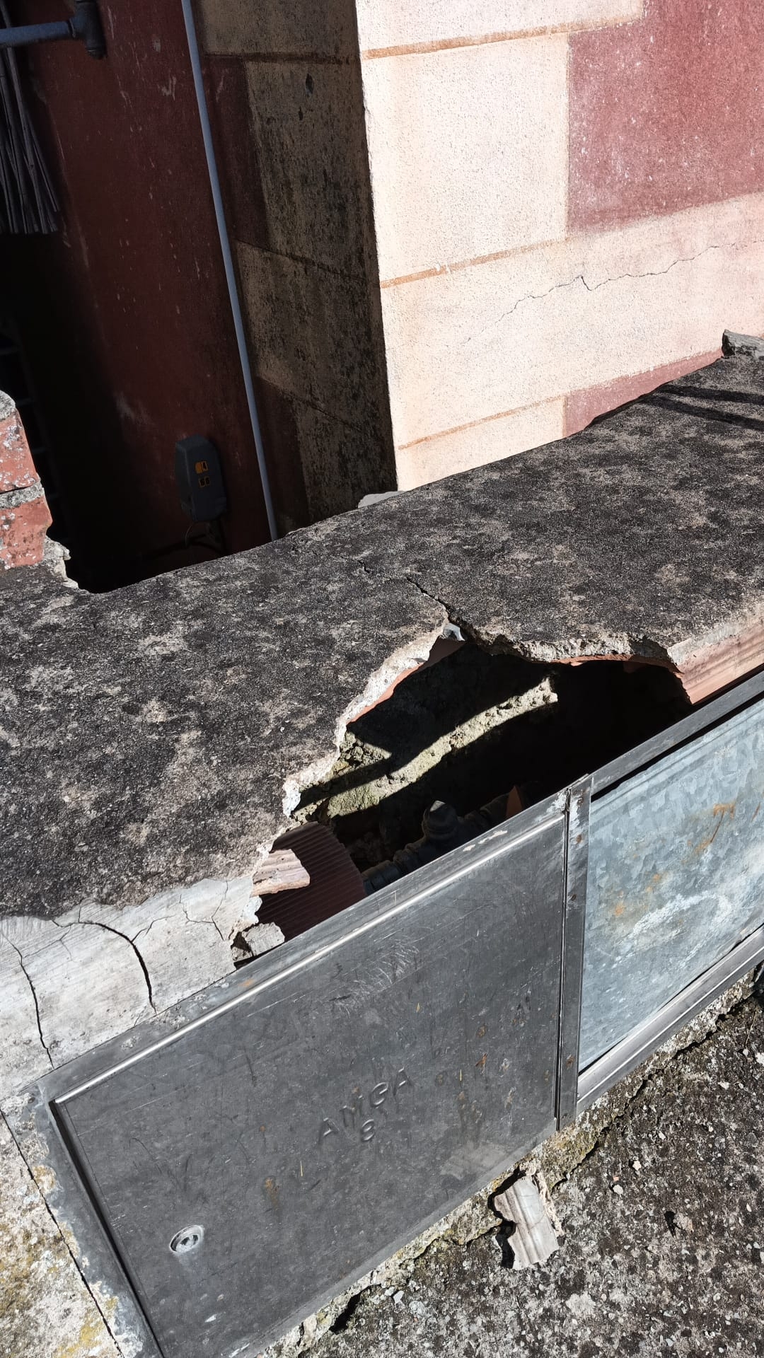Il muretto lungo la pedonale, prima del civ.5, che contiene al suo interno n.2 contatori acqua potabile, risulta spaccato e pericoloso per chi si volesse sedere.