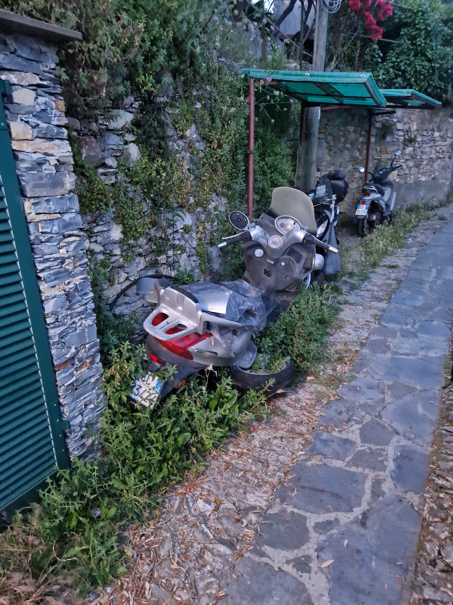 Buongiorno, segnalo la presenza di uno scooter in stato di abbandono lungo la via pedonale incrocio san gaetano/via priaruggia. Lo scooter è pericoloso per i passanti in quanto in equilibrio precario appoggiato su una ruota.